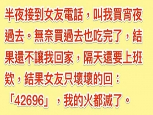 半夜接到女友電話叫我給她買宵夜過去。無奈買去了,結果她吃完又不讓我回家,因為第二天要上班,心裡難免覺得累覺得煩 。我吼到:「你還要我幹嘛?」 女朋友壞壞的說:「42696」!!!額...聽完我火一下子沒了。