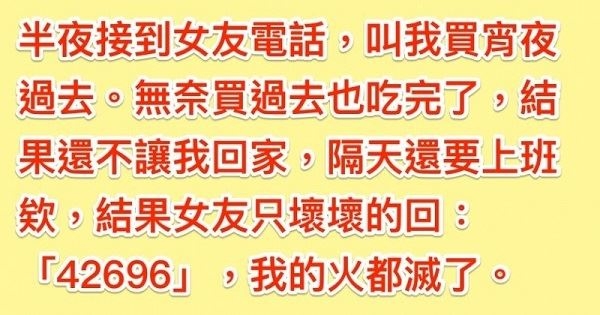 半夜接到女友電話,要當馬子狗買宵夜過去,可是明天有重要工作隻想早點回家,結果女友偷暗示「42696」,我隻好捨命奉陪了!