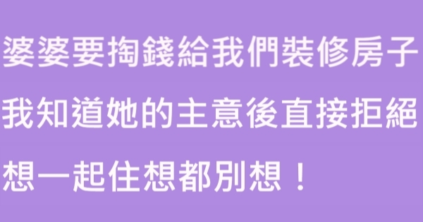 哈摟哈摟親愛的大家~~我是有錢人這麼想小編Choco!今天要來說說關「婆婆要掏錢給我們裝修房子,我知道她的主意後直接拒絕,想一起住想都別想!」的事件!讓我們一起來看看吧!
