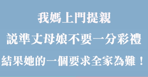 哈摟哈摟各位讀者~~我是有錢人這麼想小編Choco!今天要來說說關於「我媽上門提親,準丈母娘說不要一分彩禮,結果她的一個要求全家為難!」,不知道大家有沒有興趣呢!一起來看看是怎麼樣的事吧!