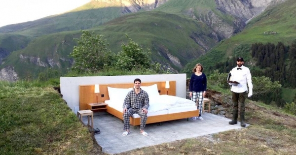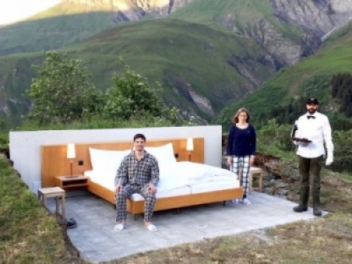 來到瑞士的這間旅館,一個晚上得花你台幣約8,000元的費用,但是這裡,沒有牆壁、沒有屋頂、沒有自來水、甚至也沒有獨立衛浴,它隻有個擁有一張床的的高級飯店。照片可以看的到,飯店裡面隻會有一張床、二個頭燈,與阿爾卑斯山腰的一片地板。而當你到達這裡的時候,會有一位管家一對一地親自貼身地服務你所有需求,當你睡醒的時候,也會親自端上專屬的早餐送給你。