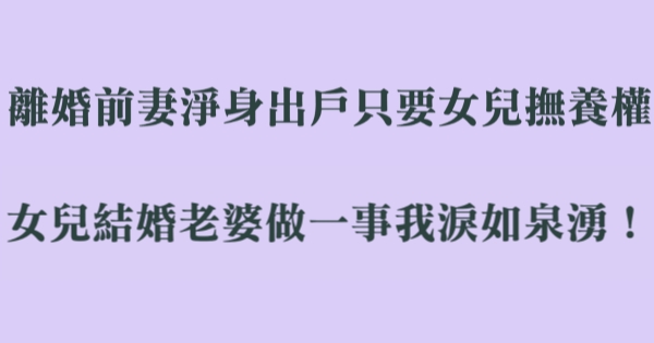大家好,我是有錢人這麼想小編Choco!今天要來說說關於離婚前妻淨身出戶只要女兒撫養權,女兒結婚老婆做一事我淚如泉湧!的事!不知道大家對於這個有多了解呢?一起來看看吧!