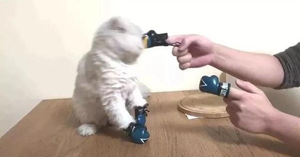 因為是貓咪定製版拳套,鏟屎官只能委屈的戴到手指頭上,隨後跟小白貓凝神對視,好半天都沒有先動手的。怕是小白貓不會玩,鏟屎官抬起手指頭對準小白貓的臉就懟了過去。