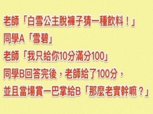 老師問「白雪公主脫褲猜一種飲料」A同學「雪碧」老師給10分,B同學回答「得到老師的100分和一巴掌!」