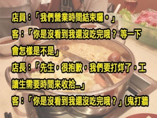 在服務業有句話說「客人是神」,所以要尊敬客人,不管他們說什麼都是對的。不過編編覺得現在這年頭,好像很多人都被台灣親切的服務態度養壞了,隻是以為自己是神,反而提出一堆超無理的要求,變成超級惹人厭的奧客!一名在火鍋店打工的網友就在靠北奧客上分享了他碰到的奧客的故事。不過很爽的是最後奧客也嚐到了教訓!