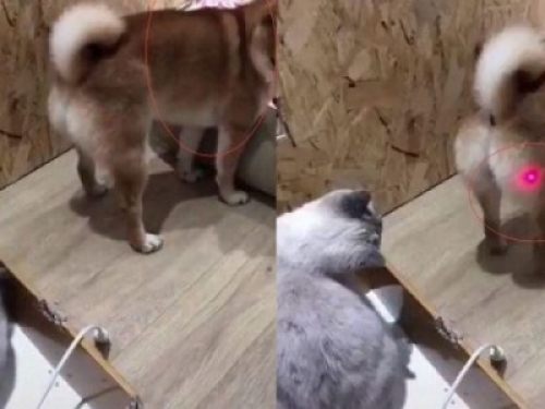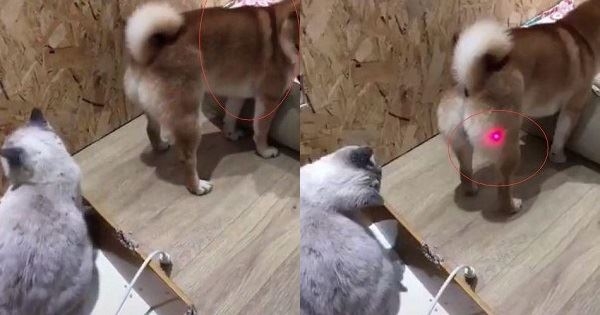 都說紅外線能讓貓咪瘋狂,下面這位主人家裡就養了一隻貓和一隻柴犬,這天,主人故意把紅外線射到柴犬的屁股上,柴犬看著前面,絲毫沒有意識到身後的危險……