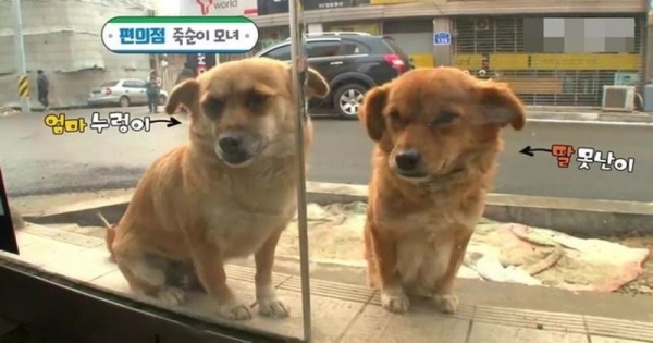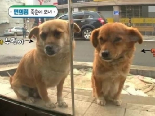 便利店外面有兩隻狗狗在徘徊。它們似乎對這裡很熟悉,知道裡面的人一定會給它們開門。看它們站在門口那期待的小眼神。