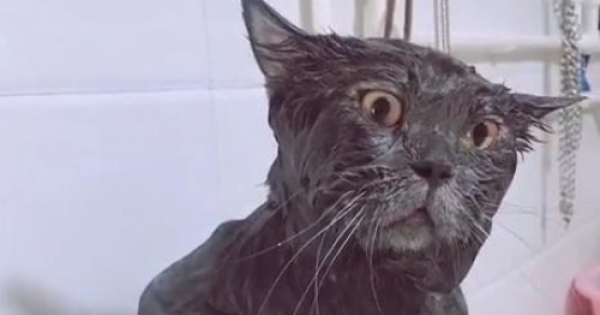 都說洗澡才是檢驗寵物們美醜的標準,只要一入水,很多寵物都會大變樣,這貓全身被弄得溼漉漉的,從它的表情看,它應該是非常不開心的。