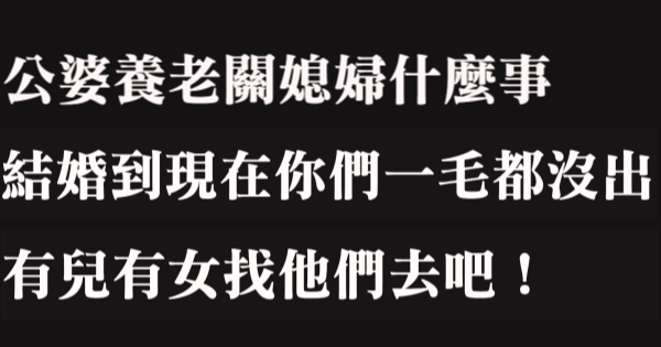 大家好,我是 Choco 今天來跟你說說 公婆養老關媳婦什麼事,結婚到現在你們一毛都沒出,有兒有女找他們去吧!吧!讓我們來看看!