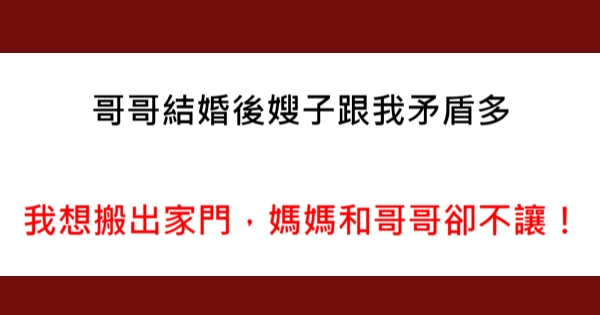 哥哥結婚後嫂子跟我的矛盾多,我想搬出家門,媽媽和哥哥卻不讓!