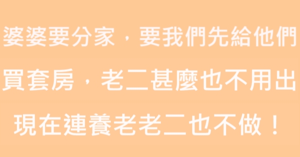 哈摟哈摟各位讀者~~我是有錢人這麼想小編Choco!今天要來說說關於「婆婆要分家,要我們先給他們買套房,老二甚麼也不用出,現在連養老老二也不做!」,不知道大家有沒有興趣呢!一起來看看是怎麼樣的事吧!