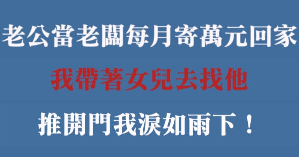 各位讀者安安阿~~我是有錢人這麼想小編Choco!今天要來說說關於「老公當老闆每月寄萬元回家,我帶著女兒去找他,推開門我淚如雨下!」,不知道大家有沒有興趣呢!一起來看看吧!