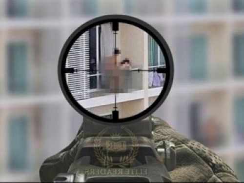 一名狙擊手走進一間武器店,想為他的步槍買一個新的瞄準鏡,他跟老闆說他隻想買最好的。老闆拿了一個給他看,並說「這個最遠可以看到一公裡以外,我家就在對面,你可以看得很清楚,我家在三樓、左邊數來第四間。」狙擊手看過去,他說「真的可以看得很清楚耶!我甚至可以看到陽台上有一對全裸的男女。」