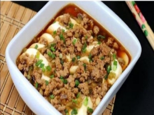 7.連肉末和汁一起倒在豆腐上,放入鍋中大火蒸10分鐘即可。