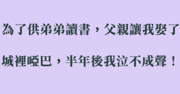 大家好,我是 Choco 今天來跟你說說 為了供弟弟讀書,父親讓我娶了城裡啞巴,半年後我泣不成聲!吧!讓我們來看看!