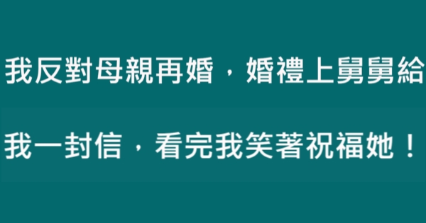 各位讀者安安阿~~我是有錢人這麼想小編Choco!今天要來說說關於「我反對母親再婚,婚禮上舅舅給我一封信,看完我笑著祝福她!」,不知道大家有沒有興趣呢!一起來看看吧!