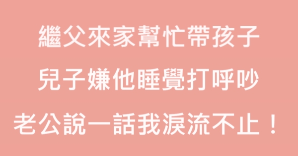 各位讀者安安阿~~我是有錢人這麼想小編Choco!今天要來說說關於「繼父來家幫忙帶孩子,兒子嫌他睡覺打呼吵,老公說一話我淚流不止!」,不知道大家有沒有興趣呢!一起來看看吧!