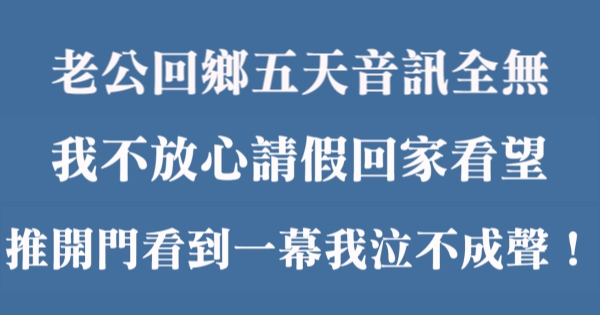 各位讀者安安阿~~我是有錢人這麼想小編Choco!今天要來說說關於「老公回鄉五天音訊全無,我不放心請假回家看望,推開門看到一幕我泣不成聲!」,不知道大家有沒有興趣呢!一起來看看吧!