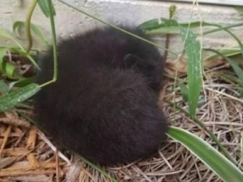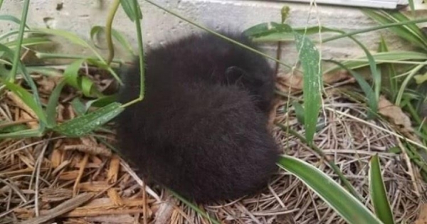 於是她撥開植物的葉子仔細翻找,最後在花壇最裡面發現了一個黑色的小毛球: