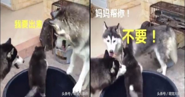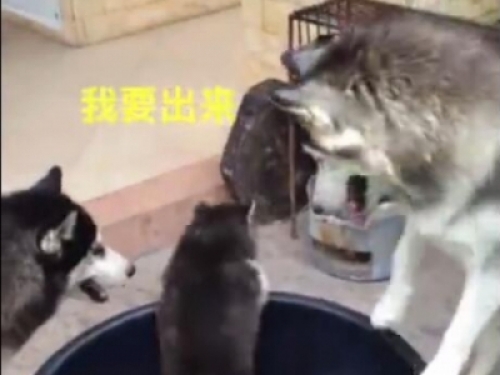 哈士奇爸爸耐心的勸著小二哈:“你腿太短了,出不來的”,說著又準備幫小二哈,可是小哈士奇非常的有骨氣,再一次拒絕了哈士奇爸爸的好意