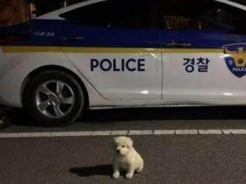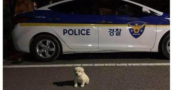 18個月前的一個晚上,一隻白色的小狗突然出現在韓國京畿道警局的門口。警察發現狗狗的腿部受了傷,看起來很虛弱,就把它先帶回了警局照顧。