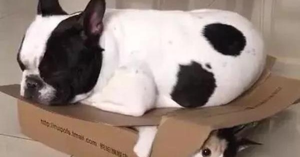 然而,狗子錯估了一件事,就是自己的體重,隨著狗子的整個身體壓在盒子上,盒頂自然就給壓下去了,直到壓到了貓咪身上,待在盒子裡的貓咪,終於被驚醒了,然而,貓咪並不知道,發生了,什麼事情,於是,只好使勁的從盒子裡面往出鑽,終於,貓咪這水一般滑溜溜的身體,還是勉強從紙盒裡面鑽出來了。