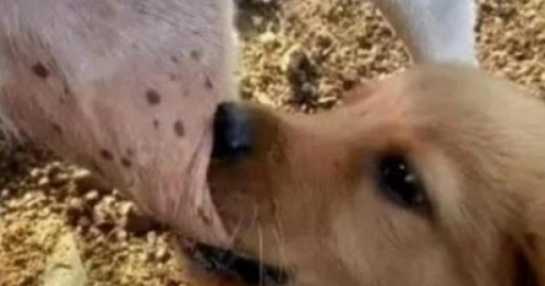 小金毛趁羊媽媽不注意喝起羊奶,動作像極了幼羊,主人想拉都拉不走!