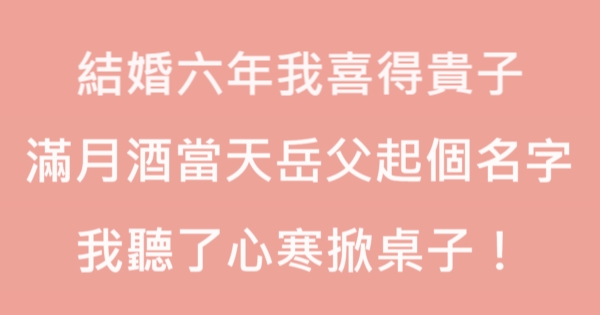 大家好,我是 Choco 今天來跟你說說 結婚六年我喜得貴子,滿月酒當天岳父起個名字,我聽了心寒掀桌子!吧!讓我們來看看!