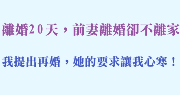 大家好,我是有錢人這麼想小編Choco!今天要來說說關於離婚20天,前妻離婚卻不離家,我提出再婚,她的要求讓我心寒!的事!不知道大家對於這個有多了解呢?一起來看看吧!