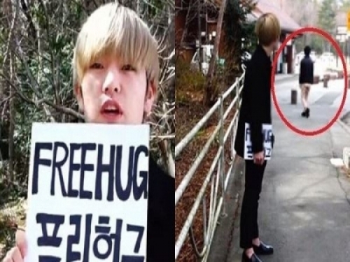 影片中,可以看到齊藤染著金髮、穿著深色外套,拿著一個手寫看板,上面寫著「FREEHUG(免費擁抱)」,希望可以「攔截」任何有結束生命念頭的人。
