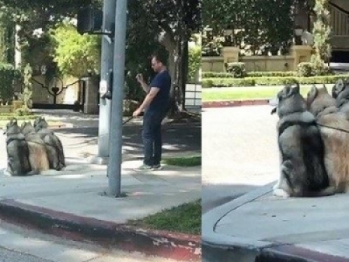 一位網友上班途中,遠遠看見三隻哈士奇排成隊蹲在路邊。
