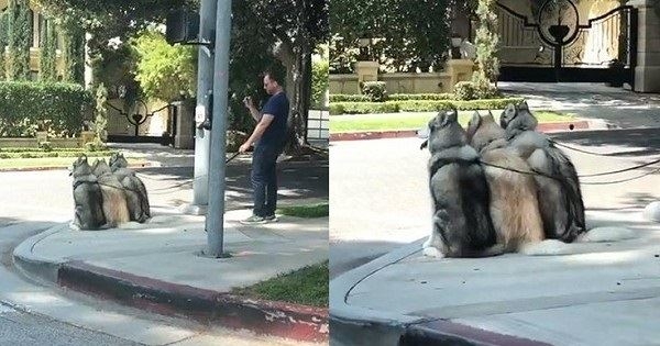 上班途中網友目睹「3隻二哈排排坐」!心想「怎麼會這麼乖...」一抬頭笑歪:主人教得真好XD!