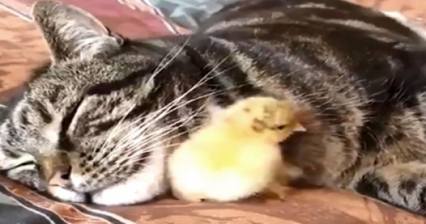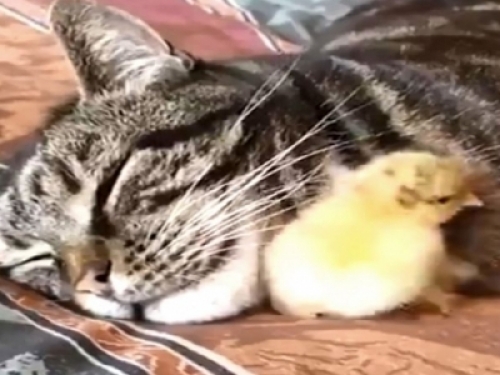 當這隻雞還是小雞仔的時候,貓那是相當的寵愛它,睡覺的時候小心翼翼地摟在懷裡,還很戒備地看著他人,生怕別人搶走!而小雞也十分的喜歡“貓媽媽”,時時圍繞在貓身邊,貓媽媽睡覺的時候,它就在一旁時而玩耍,時而依偎在貓的懷裡……