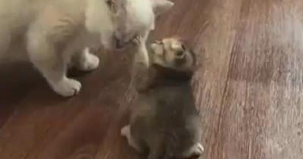 接著小奶貓開始展示它的絕活,開始打滾!它向貓媽媽撒完嬌後,馬上開始了它的動作。先在地上趴好,接著運用全身的力氣,翻了個身,接著以同樣的方式,又翻了個身~