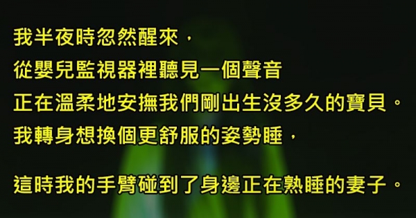 我半夜時忽然醒來,從嬰兒監視器裡聽見一個聲音,正在溫柔地安撫我們剛出生沒多久的寶貝。