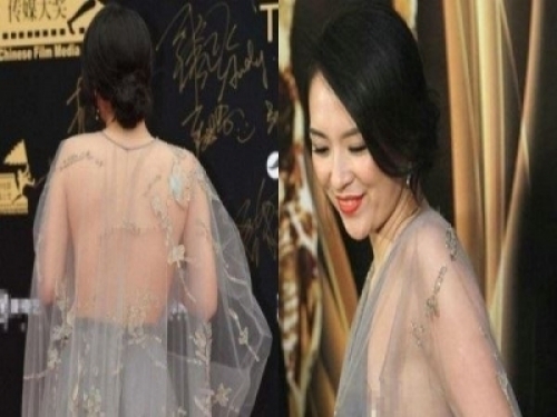 章子怡近日出席活動,穿了一件很美的透視衣,背部全祼,但罩上薄紗非常好看