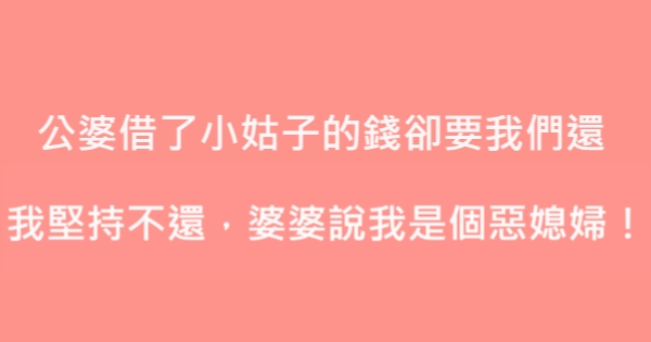 大家好,我是有錢人這麼想小編Choco!今天要來說說關於公婆借了小姑子的錢卻要我們還,我堅持不還,婆婆說我是個惡媳婦!的事!不知道大家對於這個有多了解呢?一起來看看吧!