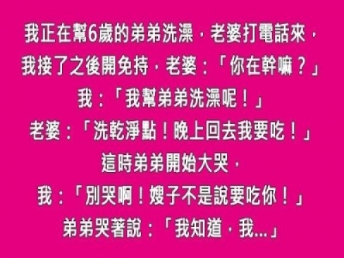 一天六歲的弟弟來家裡住幾天,晚上我正在給他洗澡,這時老婆打電話來,我接了之後開免持,老婆:「你在幹嘛?」我:「我幫弟弟洗澡呢!」老婆壓低了聲音:「洗乾淨點!晚上回去我要吃它!」這時弟弟開始大哭,我急忙說:「別哭啊!嫂子不是說要吃你!」弟弟哭著說:「我知道,我也想有個這麼讚的老婆!」