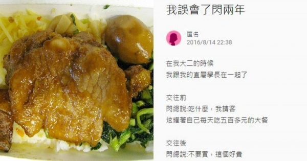下面這位女網友分享自己的親身經歷,她男友交往前都會請她吃大餐,交往後卻餐餐都是60元的便當!