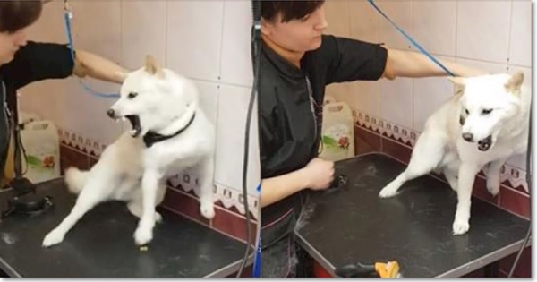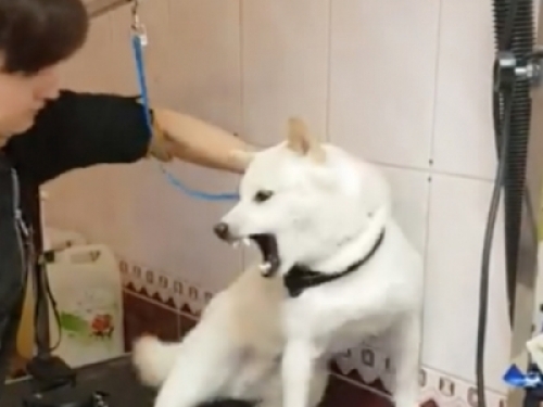 畫面中,這隻白色狗狗來到陌生的環境、非常緊張害怕,所以不斷地縮到牆壁邊,一邊對美容師瘋狂叫囂!