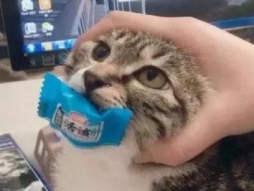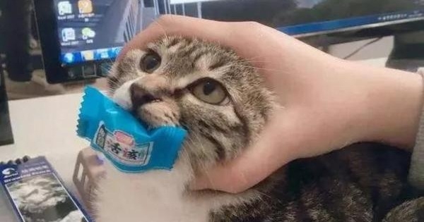 貓咪偷吃被主人逮住了,嘴裡還叼著一顆糖,看到這畫面真的太搞笑了!!