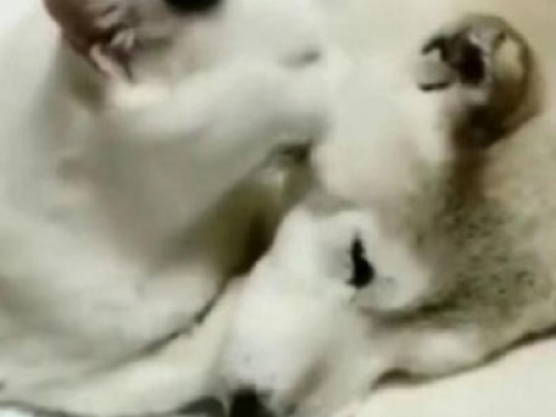 柴犬Shiro看上去快要跌倒時,Kuku就會馬上去幫忙,它會主動走到Shiro的前面,然後用自己的背支撐起Shiro的頭部以防Shiro摔倒。