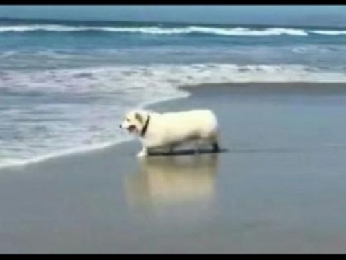 鏟屎官帶著柯基去海邊玩耍,柯基精力特別旺盛,直接甩了主人奔向大海,沒想到剛跑到大海面前便躊躇不前,鏟屎官內心:你就裝吧!