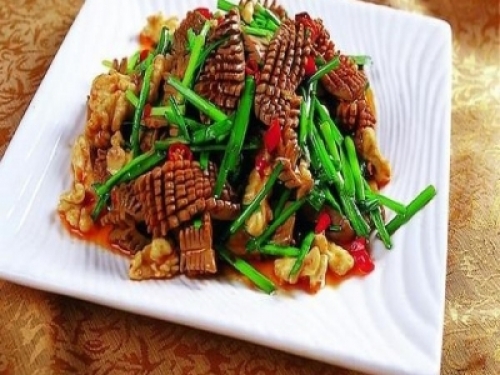 3、鍋內放油20克燒熱,下入西蘭花塊煸炒,下入枸杞子、核桃仁炒勻至熟。下入腰花,烹入用餘下的調料(不含植物油)對成的芡汁翻勻,出鍋裝盤即成。