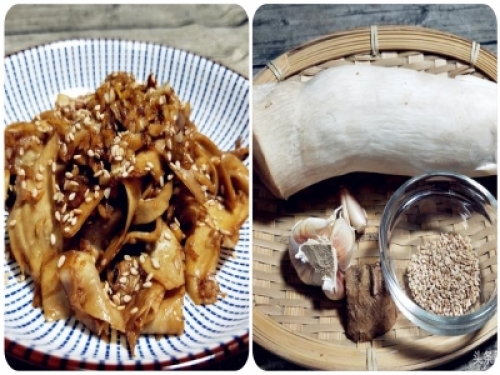 【乾煸杏鮑菇】 【材料】:杏鮑菇1根,姜1小塊,大蒜6瓣,生抽1勺,老抽半勺,白糖1小勺,蠔油1勺,孜然粉1小勺,芝麻油1小勺,白熟芝麻適量。
