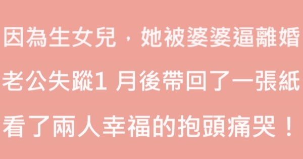 哈摟哈摟親愛的大家~~我是有錢人這麼想小編Choco!今天要來說說關「因為生女兒,她被婆婆逼離婚,老公失蹤1月後帶回了一張紙,看了兩人幸福的抱頭痛哭!」的事件!讓我們一起來看看吧!