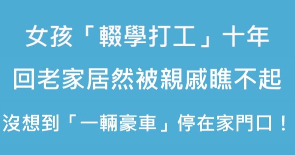 哈摟哈摟各位讀者~~我是有錢人這麼想小編Pineapple!今天要來說說關於「女孩「輟學打工」十年,回老家居然被親戚瞧不起,沒想到「一輛豪車」停在家門口!!」,不知道大家有沒有興趣呢!一起來看看是怎麼樣的事吧!