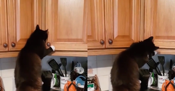 喵喵在櫃子前詭異的樣子,讓主人上前喝止,居然意外發現一個大秘密!