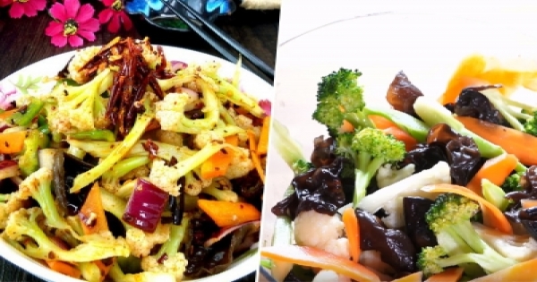菜花半棵,洋蔥20克,青椒半個,胡蘿蔔少許,乾木耳幾朵。辣椒碎1勺,麻油1勺,芝麻油少許,生抽半勺,雞粉少許,糖少許,鹽半勺,醋少許,花椒粉少許。