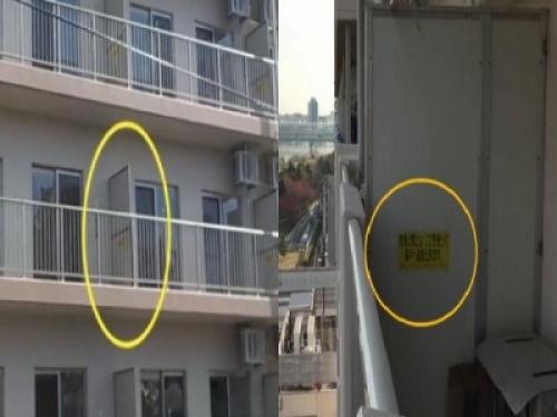 我們再看看日本的陽台,鄰居與鄰居之間只隔著五毫米後的石膏板,不頂著天花板,也不貼著地板,只有靠牆壁的那一部分是封閉的,上面還有一段標語是「緊急時刻,請破壞此處,去隔壁避難。」